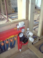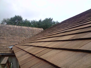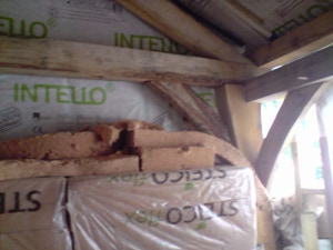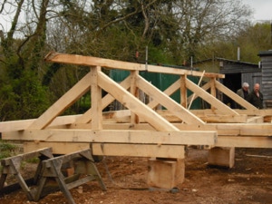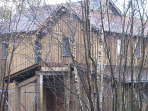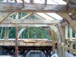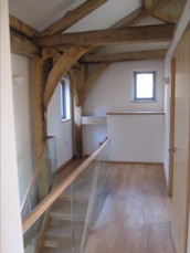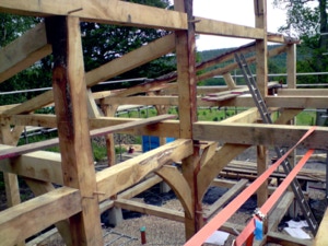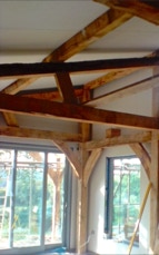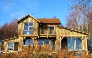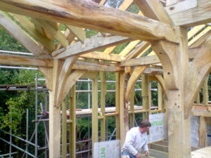 A new build farmhouse in Kent, self sufficient in energy. The house is highly airtight, insulated with hemp insulation, and is clad in oak with oak shakes on the roof. The green oak frame is made from trees grown on the property, and a wind turbine and photovoltaics provide all the electrical energy, with underfloor heating powered by a wood burning kitchen range.